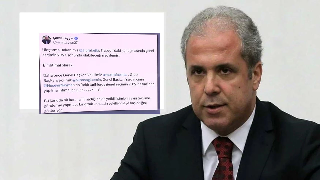 Uraloğlu'nun açıklamasının ardından AKP'nin sembol isimlerden Şamil Tayyar'da erken seçim mesajı paylaştı. Tayyar da 2027 Kasım ayını işaret etti:Ulaştırma Bakanımız, Trabzon'daki konuşmasında genel seçimin 2027 sonunda olabileceğini söylemiş.