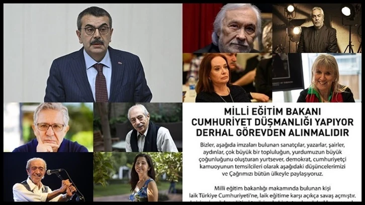 Böyle bir kişi Milli Eğitim Bakanlığı gibi ülkemizin ve en değerli varlıklarımız olan çocuklarımızın yaşamları ile ilgili bu kadar önemli bir makam- da bir saniye bile kalamaz. Cumhuriyet savcılarını,velileri, konuyla ilgili herkesi, bütün Cumhuriyetçileri göreve çağırıyoruz. Bizler, Sev- gili ülkemizin, laik, çağdaş, Cumhuriyet değerlerine sahip sanatçıla- rı, yazarları, şairler aydınları bu kişiyi ve sözlerini lanetle kınıyor, bu alanda ve bu konuda üstümüze düşecek olan her türlü görevi yap- maya hazır olduğumuzu sevgili halkımıza bildiriyoruz.