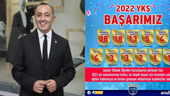 SANKO Okulları 2022 mezunu 28 öğrenci mühendislik, 18 öğrenci tıp, 13 öğrenci iktisadi ve idari bilimler, 5 öğrenci hukuk, 4 öğrenci mimarlık, 4 öğrenci yurt dışı, 3 öğrenci diş hekimliği, 3 öğrenci tasarım, 2 öğrenci fen edebiyat, 1 öğrenci eczacılık ve 1 öğrenci ise uygulamalı bilimler fakültelerini kazanarak büyük bir başarıya imza attılar.