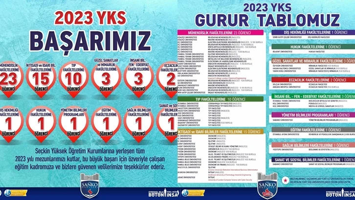 SANKO Okulları 2023 Mezunları, Yüksek Öğretim Kurumları Sınavı (YKS) yerleştirme sonuçlarının açıklanmasıyla başarılarını taçlandırdı.