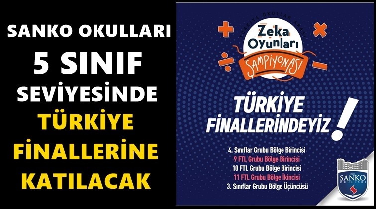 SANKO Okulları, Türkiye Okullar Arası Zeka Oyunları Şampiyonası Bölge Finallerinde üç bölge birinciliği, bir bölge ikinciliği ve bir bölge üçüncülüğü elde ederek beş sınıf seviyesinde Türkiye finallerine katılma hakkı kazandı.