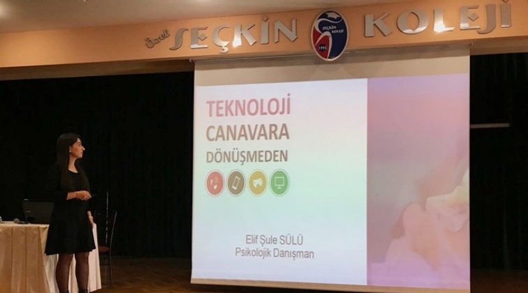 Özel Seçkin Koleji Rehber Öğretmeni Elif Şule Sülü’nün AKM Konferans Salonu'nda yaptığı “Teknoloji Bağımlılığı” konulu seminerde, velilere çocuklarını nasıl yönlendirmeleri gerektiği, müdahale etmeleri gereken durumlarda nasıl davranmalarıyla ilgili bilgilendirme yapıldı. Öğrencilerin akademik başarısının etkilenmesi, sosyal hayattan uzaklaşması ve aile içi iletişim bozuklukları gibi konularda detaylı bilgilendirmelerde bulunan Sülü "Aşırı kullanma isteğinin önüne geçilemeyen, kullanılma bırakıldığında kişide sıkıntı verecek duygu durumlarının oluştuğu ailevi ve sosyal hayatı bozan davranışlar." diye tanımlanan teknoloji bağımlılığı özellikle çocuklar için büyük bir tehlike oluşturduğunu söyledi.