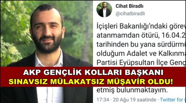 AKP Eyüp Gençlik Kolları Başkanı Cihat Biradlı’nın, İçişleri Bakanlığı’na sınava girmeden müşavir olarak atandığı belirlendi.