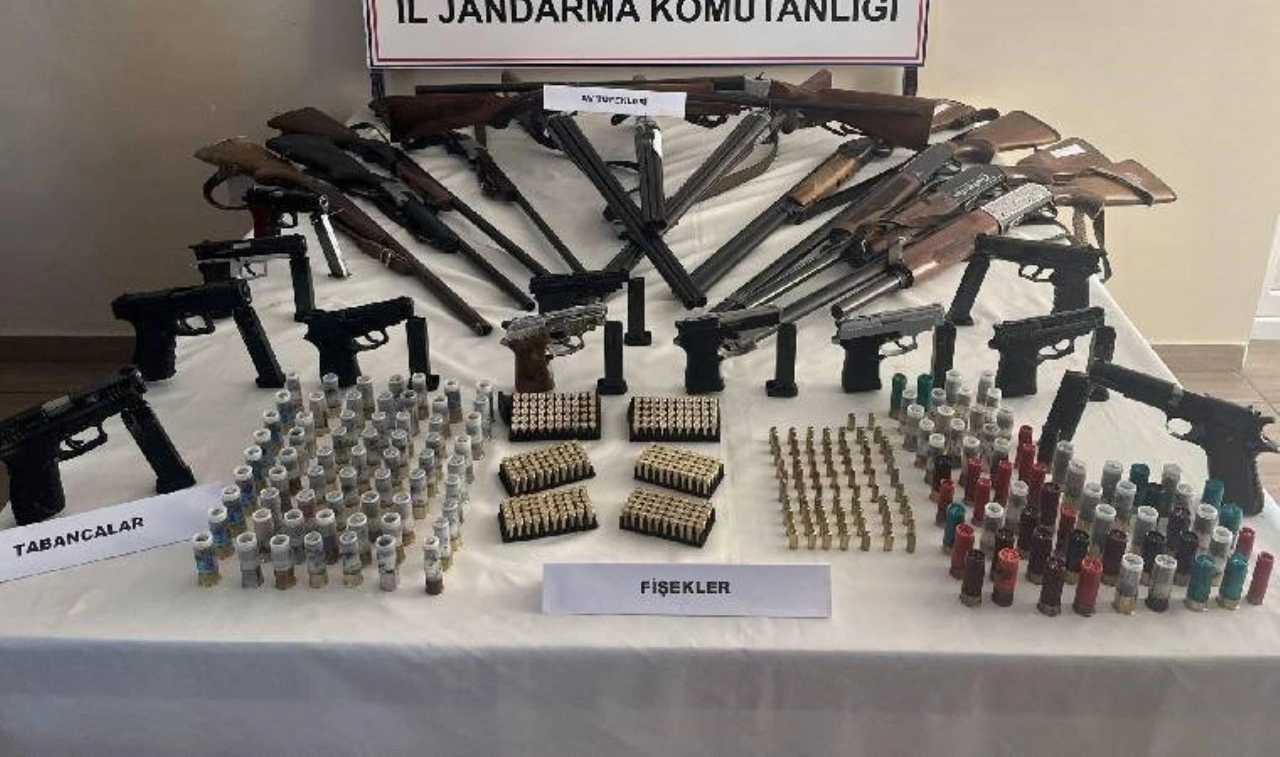Operasyonda adreslerde yapılan aramalarda; 12 ruhsatsız tabanca, 13 ruhsatsız av tüfeği, bu silahlara ait 215 fişek ile 12 şarjör ele geçirildi.
