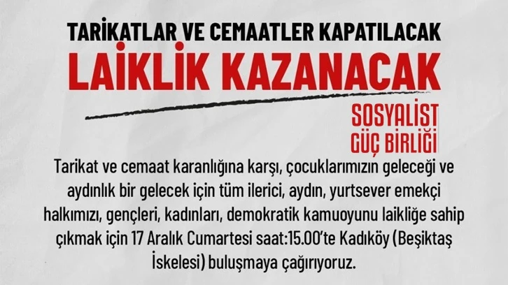 “Tarikat ve cemaat karanlığına karşı, çocuklarımızın geleceği ve aydınlık bir gelecek için tüm ilerici, aydın, yurtsever emekçi halkımızı, gençleri, kadınları, demokratik kamuoyunu laikliğe sahip çıkmak için 17 Aralık Cumartesi Saat 15:00’te Kadıköy’de (Beşiktaş İskelesi) buluşmaya çağırıyoruz.”