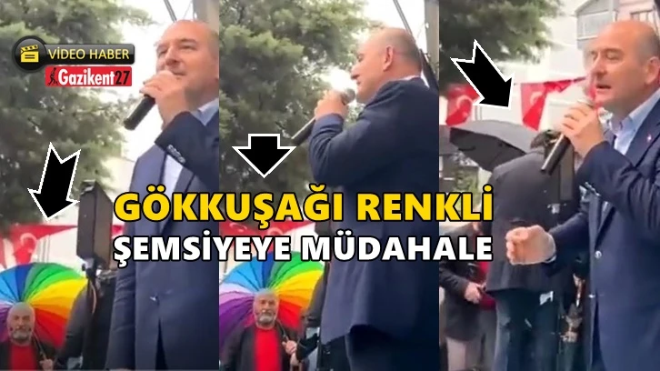 İçişleri Bakanı Süleyman Soylu'nun konuşma sırasında gökkuşağı renklerinde şemsiye açılmasına korumalar müdahale etti.