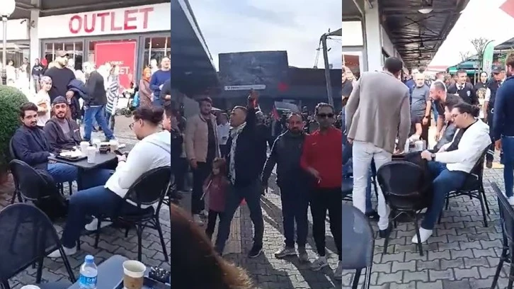 Kocaeli’nin İzmit ilçesinde Filistin bayraklarıyla ve sloganlarla İsrail’i protesto eden bir grup, daha sonra Sanayi Mahallesi Ömer Türkçakal Bulvarı üzerinde bulunan bir AVM’ye gitti. Burada bulunan bir kahve zincirini protesto eden grup, daha sonra masalarda oturanlara tepki gösterdi.