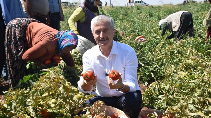 Çiftçilere toplam 43.500.000 adet domates, biber, salatalık, patlıcan ve kavun fidesi dağıtan Başkan Mehmet Tahmazoğlu, çiftçiler ile birlikte domates toplayıp, sohbet etti.