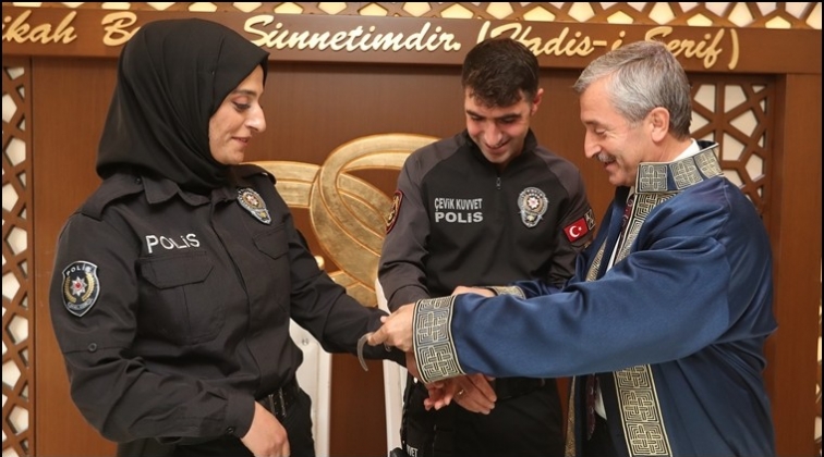 Şahinbey Belediye Başkanı Mehmet Tahmazoğlu, polis çiftin nikâhını kıyıp, kelepçe takarak bir ömür ayrılmamaları temennisinde bulundu.