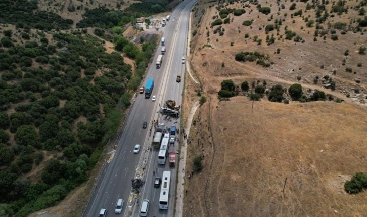 Yan yatan tır, vinç yardımıyla kaldırılırken, İzmir istikametine trafik akışı tek şeritten kontrollü olarak sağlandı. Yaklaşık 12 kilometre uzunluğundaki araç kuyruğu ise dron ile havadan görüntülendi.