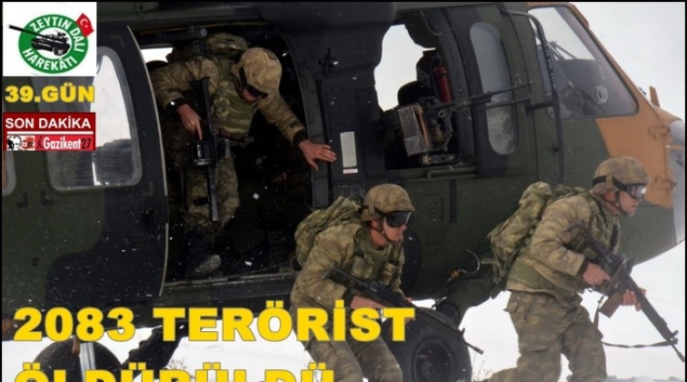 Türk Silahlı Kuvvetleri (TSK), Afrin’in teröristlerden temizlenmesi için 20 Ocak’ta başlatılan Zeytin Dalı Harekatı kapsamında bu güne kadar etkisiz hale getirilen terörist sayısının 2083 olduğunu açıkladı.