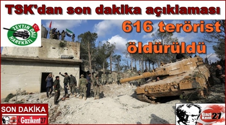 TSK'dan akşam saatlerinde iki ayrı açıklama geldi. Yapılan son dakika açıklamasına göre; Zeytin Dalı Harekâtı'nda bugün 19 PKK/KCK/PYD-YPG ve DEAŞ terör örgütü mensubunun daha etkisiz hale getirildiğini açıkladı.