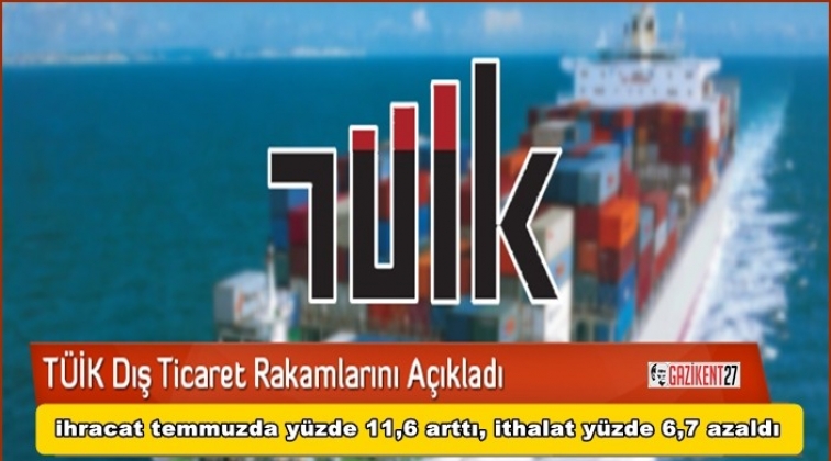 TÜİK verilerine göre, ihracat temmuzda yıllık bazda yüzde 11,6 artarak 14 milyar 77 milyon dolar, ithalat yüzde 6,7 azalarak 20 milyar 59 milyon dolar oldu.
