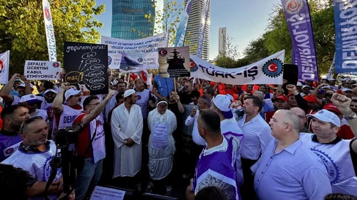 Kamu kurum ve kuruluşlarındaki 600 bin işçiyi kapsayan Kamu Toplu İş Sözleşmeleri Çerçeve Protokolü görüşmelerin tıkanması üzerine eyleme çıkan TÜRK-İŞ’e bağlı sendikalar 81 ilde AKP önünde toplandı. İzmir’de de Bayraklı’daki AKP İl Başkanlığı önünde toplanan işçiler temsili tabut, ölü ve imamla geldi. “Zafer direnen emekçinin olacak”, “Şimşek zammını al başına çal”, “Sefalet ücreti istemiyoruz”, “Vergide adelet istiyoruz”, “Kurtuluş yok tek başına ya hep beraber ya hiçbirimiz”, “Vur vur inlesin Mehmet Şimşek dinlesin” sloganları atan işçilere siyasi partilerin de destek verdi. İşçiler adına basın açıklamasını okuyan TÜRK-İŞ 3. Bölge Başkanı Hayrettin Çakmak, “81 ilde AKP İl binaları önünden sesleniyoruz. 2025 yılı Toplu İş Sözleşmesi sürecinde kamu işçilerinin insanca yaşam taleplerini görünür kılmak, kamuoyunu bilgilendirmek ve hükümetin sorumluluklarını yerine getirmesini sağlamak amacıyla başlatmış olduğumuz eylem süreci kararlılıkla devam etmektedir. Geçtiğimiz hafta işyerleri önünde gerçekleştirdiğimiz bildiri okumalarının ardından, bu hafta şehir meydanlarında kitlesel basın açıklamaları gerçekleştirdik. Tüm illerimizde eş zamanlı olarak planlanan bu açıklamalar, kamu emekçilerinin birliğini ve taleplerinin ciddiyetini gösterecek önemli bir adımdı. Bugün de eylem planımız dahilin de, Türkiye’nin dört bir yanında AK Parti İl Binalarının önündeyiz. Çünkü artık sabrımız kalmadı! Çünkü artık yoksulluğa, adaletsizliğe, duyarsızlığa tahammülümüz kalmadı!” dedi.