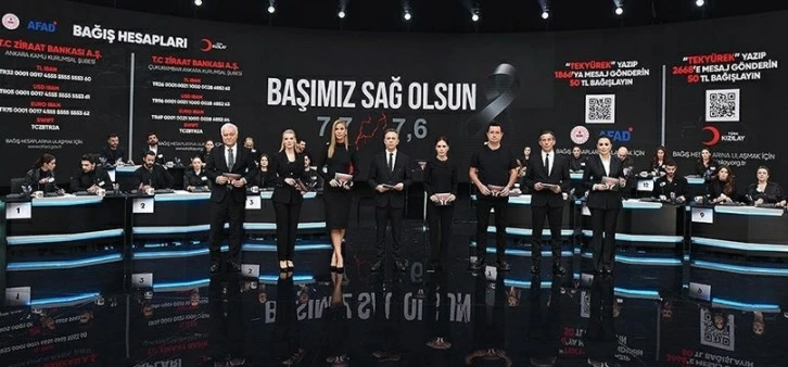 Türkiye’nin yüreğinde derin yaralar açan, son yüzyılın en büyük deprem felaketinin yaşandığı bu günlerde tüm televizyon kanalları yardım için ortak yayında bir araya geldi. Sanat, iş ve spor dünyasının önde gelen isimleri ve halk depremzedelere destek oluyor. Şu ana kadar toplam bağış, 100 milyar TL'yi geçti. Şu ana kadar en büyük bağışı 30 milyar TL ile Merkez Bankası yaptı. Bağış miktarı; an itibarıyla 108 milyar 663 milyon 563 bin TL'ye, atılan SMS sayısı ise 6 milyon 862 bine ulaştı.