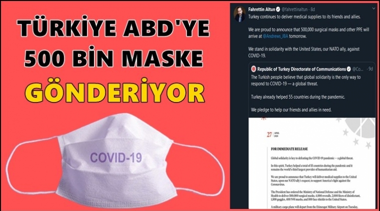 Cumhurbaşkanlığı İletişim Başkanı Fahrettin Altun, sosyal medyadan yaptığı paylaşımda Türkiye'nin ABD'ye 500 bin cerrahi maske göndereceğini söyledi.