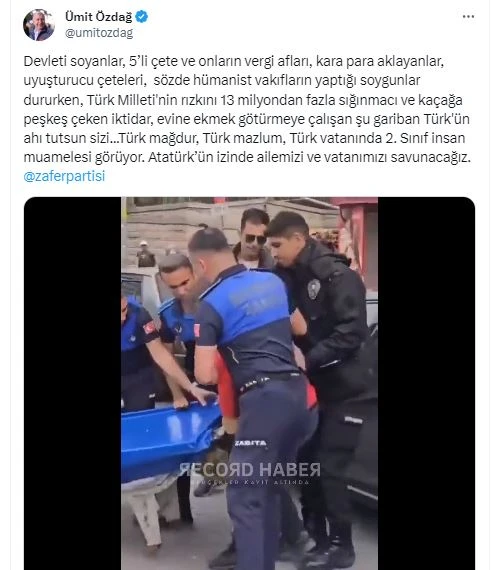 O görüntüleri paylaşan Özdağ, "Devleti soyanlar, 5’li çete ve onların vergi afları, kara para aklayanlar, uyuşturucu çeteleri, sözde hümanist vakıfların yaptığı soygunlar dururken, Türk Milleti'nin rızkını 13 milyondan fazla sığınmacı ve kaçağa peşkeş çeken iktidar, evine ekmek götürmeye çalışan şu gariban Türk'ün ahı tutsun sizi...Türk mağdur, Türk mazlum, Türk vatanında 2. Sınıf insan muamelesi görüyor. Atatürk’ün izinde ailemizi ve vatanımızı savunacağız." ifadelerini kullandı.
