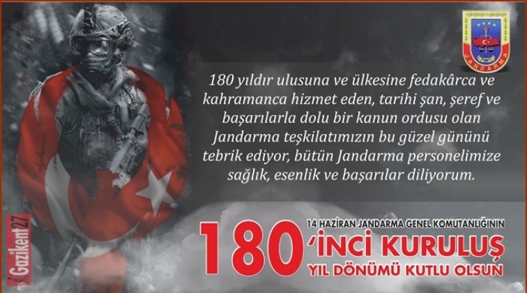 180 yıldır ulusuna ve ülkesine fedakârca ve kahramanca hizmet eden, tarihi şan, şeref ve başarılarla dolu bir kanun ordusu olan Jandarma teşkilatının, bu güzel gününü tebrik ediyor, bütün Jandarma personelimize sağlık, esenlik ve başarılar diliyorum."
