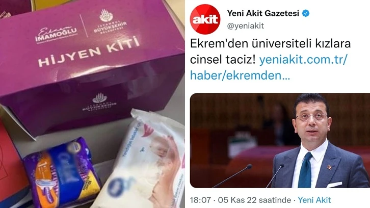 Yeni Akit, İstanbul Büyükşehir Belediyesi (İBB) tarafından kız öğrencilere dağıtılan hijyenik pedler üzerinden Belediye Başkanı Ekrem İmamoğlu'nu hedef aldı. Yeni Akit tarafından, "Ekrem'den üniversiteli kızlara cinsel taciz" başlığı atıldı.