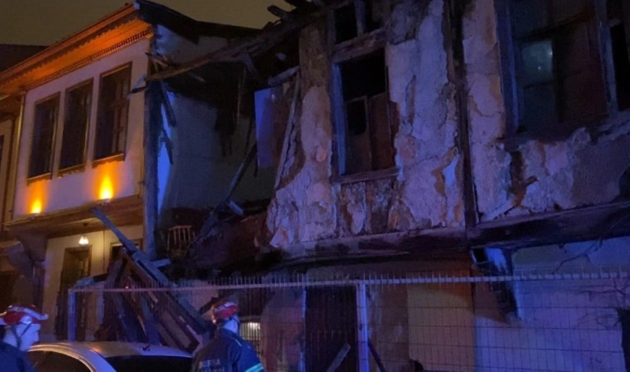 Hastane Meydanı Sokak'ta bulunan 2 katlı metruk binanın bir kısmı büyük gürültüyle yıkıldı.