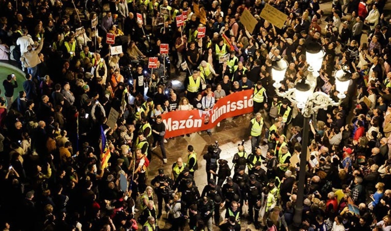 Bölgede faaliyet gösteren 65 sivil toplum kuruluşunun (STK) çağrısıyla Valensiya ve Alicante kentlerinde düzenlenen gösterilerde, 'Mazon istifa' yazılı bir pankartın arkasında yürüyen kalabalık, sel felaketinde çok sayıda kişinin hayatını kaybetmesinin sorumlusu olarak Valensiya özerk hükümeti başkanı Mazon'u gösterdi.