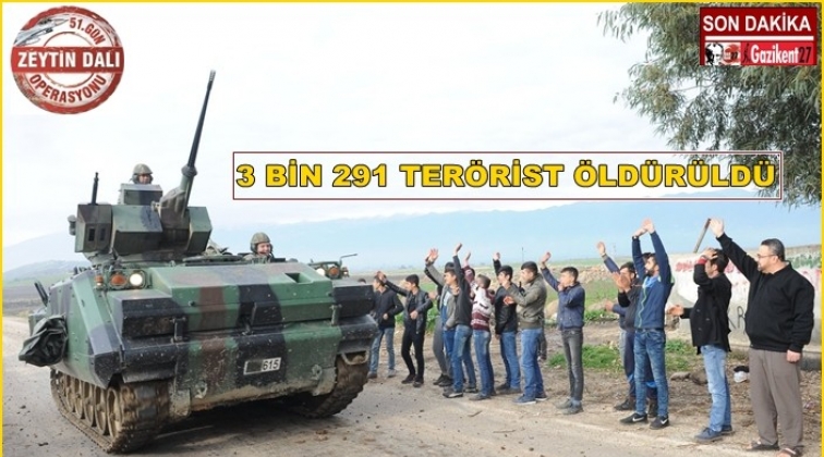 Türk Silahlı Kuvvetleri (TSK) Afrin'de yürütülen Zeytin Dalı Harekâtı'nın 51. gününde etkisiz hale getirilen terörist sayısının 3 bin 291 olduğunu açıkladı.
