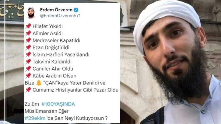 Müdafa-i İslam Hareketi Başkanı Erdem Özveren, Cumhuriyet'in 100'üncü yılını hedef aldığı paylaşımında "Zulüm 100 yaşında" ifadelerini kullandı. Özveren'in paylaşımına tepki yağdı.