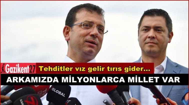 İmamoğlu, Cumhurbaşkanı Erdoğan'ın Ordu Valisi'ne hakaret iddiasıyla ilgili kurduğu "Ceza süresi uzarsa başkanlığı düşer, tıpkı benim gibi" cümleye, "Seçime 2 gün kala Ekrem İmamoğlu'nu tehdit edecekler. Ortada hiçbir suç duyurusu yok, mahkeme yok. Şimdiden suçu tanımlayacaklar. Görevden meni tanımlayacaklar. Ne oluyor bu İstanbul'da? Anlıyorsunuz değil mi meselenin ne kadar büyük olduğunu? Herkesin anlamasını istiyorum. Mesele Ekrem İmamoğlu'nun hakaret etti etmedi meselesi değil. Her gün şapkadan tavşan çıkarmaları, tehdit etmeleri. İmamoğlu'nu tehdit edecekler. Sayın Yıldırım güzel demişti geçen hafta, o vazgeçer ama ben vazgeçmem: Vız gelir tırıs gider. Milet var arkamızda. Hem de milyonlarca millet var arkamızda'' yanıtını verdi.