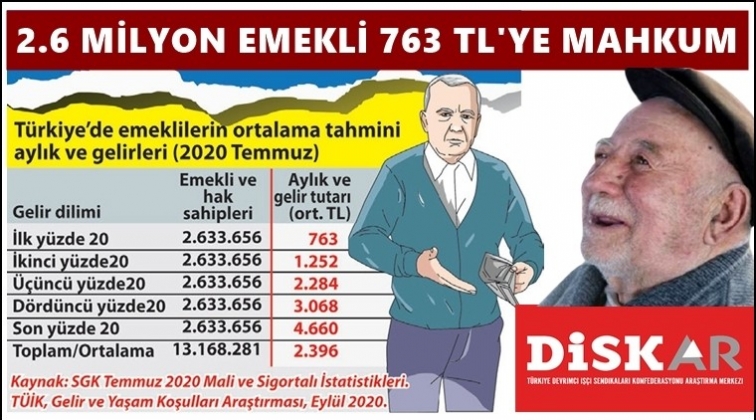 DİSK-AR’ın yaptığı araştırmaya göre 2.6 milyon emeklinin geliri 763 lirayı ancak buluyor. 13.2 milyon emeklinin 7.9 milyonu ise asgari ücretin altında bir aylıkla geçinmeye çalışıyor.