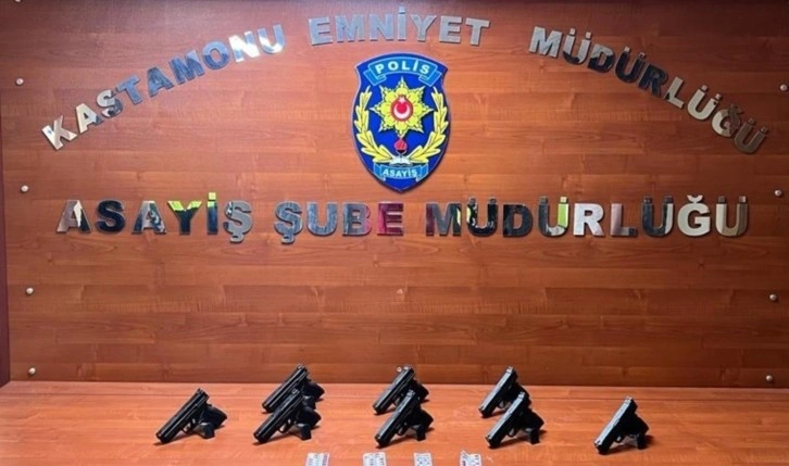 Aramada 8 adet ruhsatsız tabanca, tabancalara takılı vaziyette 8 adet şarjör ile 49 adet sentetik ecza hapı ele geçirildi.