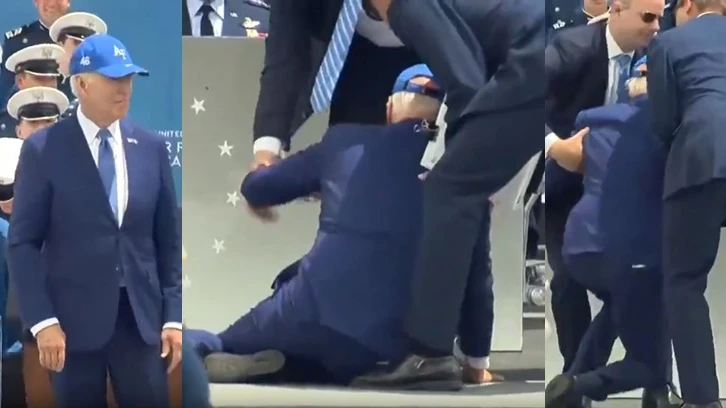 Colorado'da, ABD Hava Kuvvetleri Akademisi mezuniyet töreninde konuşma yapan Biden, alkışlar eşliğinde sahneden ayrılırken bir anda yere düştü. Korumaları yardımıyla tekrar ayağa kalkan Biden'ın düşme görüntüsü kameraya yansırken, törene katılanların kahkahaları dikkat çekti. 80 yaşındaki Biden'ın düştükten sonra yerdeki kum torbalarını işaret ettiği görülürken, o anlar sosyal medyada gündeme oturdu.