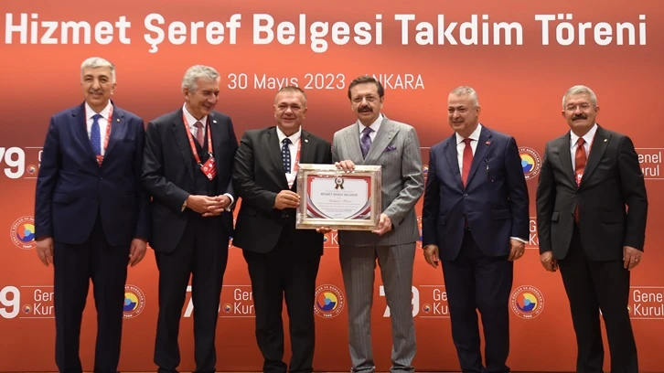 TOBB 79. Genel Kurulu Hizmet Şeref Belgesi Takdim Töreni, Cumhurbaşkanı Recep Tayyip Erdoğan’ın katılımıyla, Ankara’da TOBB İkiz Kuleler Konferans Salonu’nda gerçekleştirildi.