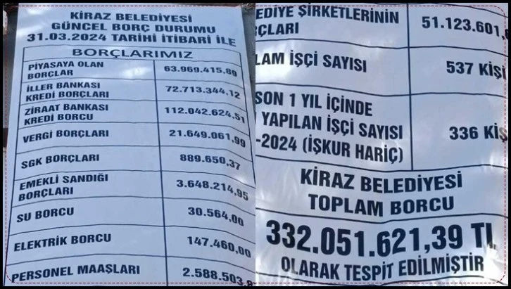 31 Mart seçimlerinden sonra AKP’den CHP’ye geçen İzmir Kiraz Belediyesi’nin mali tablosu belediye binasına asıldı. Kiraz Belediyesi’nin toplam borcunun 332 milyon 51 bin 621 TL olduğu, belediyeye son bir yıl içinde 336 kişinin işe alındığı görüldü.