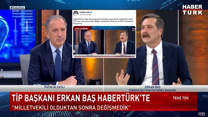 Habertürk ekranlarında Fatih Altaylı'nın konuğu olan TİP Genel Başkanı Erkan Baş, dikkat çeken açıklamalarda bulundu. Yayının ardından AKP Genel Başkan Yardımcısı Hamza Dağ, Baş'ın Habertürk'te katıldığı yayınla ilgili olarak, "Bir moderatör ve bir TİP’li var zannediyorduk. Meğer moderatör yokmuş" diye gönderme yaptı.