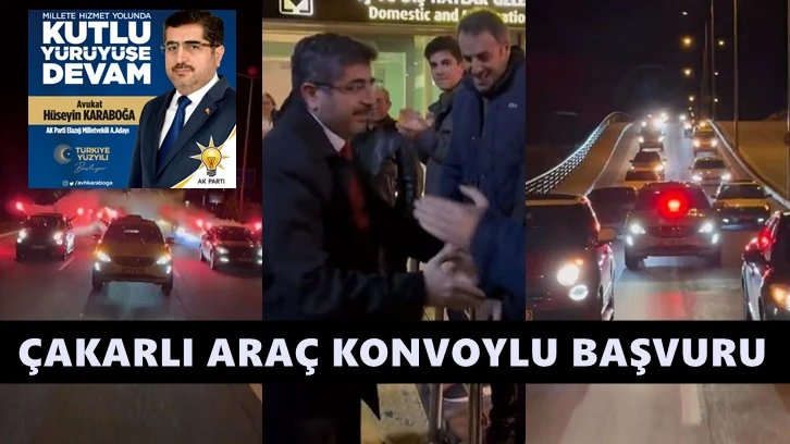 Çakarlı araç konvoyuyla adaylık başvurusuna giden avukat Hüseyin Karaboğa'nın sosyal medyada paylaştığı görüntülere tepki yağdı.