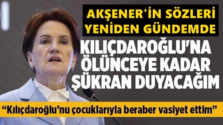 İYİ Parti Genel Başkanı Meral Akşener’in, memleketi Kocaeli’de yaptığı konuşmasında CHP Genel Başkanı Kemal Kılıçdaroğlu hakkındaki “Kendisine herhalde ölünceye kadar şükran duyacağım. Ben sülaleme ‘Sayın Kılıçdaroğlu’nu çocuklarıyla beraber’ vasiyet ettim.” ifadeleri yeniden gündem oldu.
