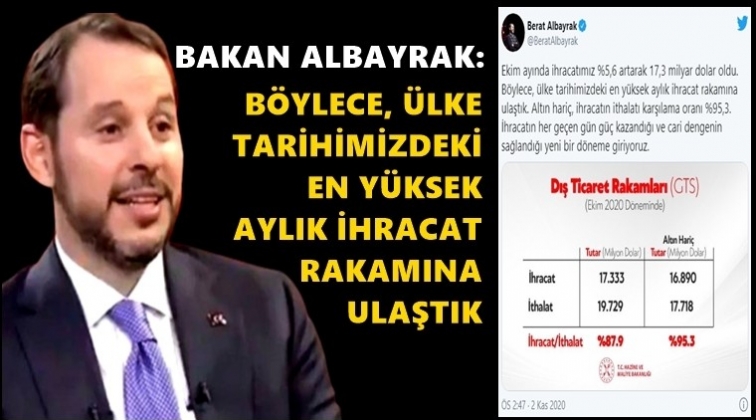 Twitter hesabından yaptığı açıklamada, ekim ayına ilişkin ihracat verilerini değerlendiren Albayrak, "Ekim ayında ihracatımız %5.6 artarak 17.3 milyar dolar oldu. Böylece, ülke tarihimizdeki en yüksek aylık ihracat rakamına ulaştık. Altın hariç, ihracatın ithalatı karşılama oranı %95.3. İhracatın her geçen gün güç kazandığı ve cari dengenin sağlandığı yeni bir döneme giriyoruz" dedi.