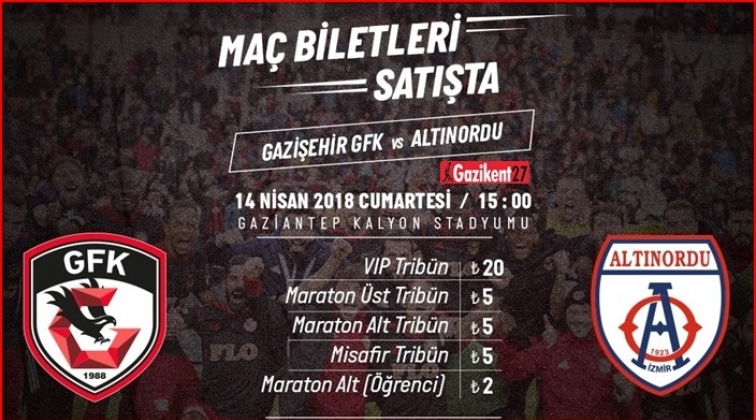 Gazişehir Gaziantep FK'nın, TFF 1. Lig'in 31. haftasında kendi sahasında oynayacağı Altınordu maçı biletleri satışa sunuldu.
