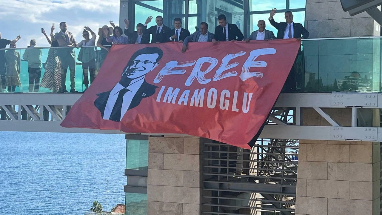 CHP Antalya milletvekilleri Aliye Coşar, Aykut Kaya, Cavit Arı, Mustafa Erdem, Sururi Çorabatır, miting öncesi kent merkezindeki önemli noktalardan biri olan Tophane Parkı’na, İmamoğlu’nun fotoğrafının yer aldığı ve “Free İmamoğlu” (İmamoğlu’na Özgürlük) yazılı pankartı astı.