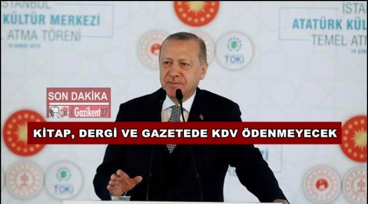 Cumhurbaşkanı Erdoğan AKM'de temel atma töreninde konuştu. Erdoğan burada yaptığı konuşmada, "Kitapta ve süreli yayınlarda KDV oranını sıfıra düşürülecek. Artık kitapta dergide gazetede KDV ödenmeyecek. Böylece yayıncılarımıza önemli bir destek sağlayacağız." dedi.