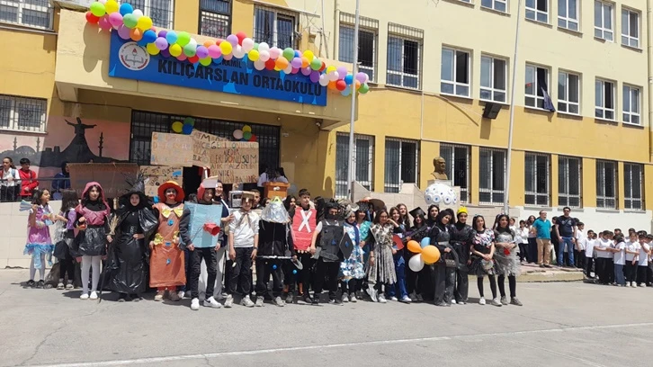 Gaziantep’in Şehitkamil İlçesinde bulunan Kılıçarslan Ortaokulu’nda öğrencilerin geri dönüşüme dikkat çekmek amacıyla atık malzemelerden hazırladıkları kıyafetlerle sunduğu defile büyük ilgi çekti.