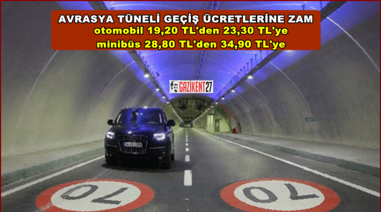 Avrasya Tüneli geçiş ücretlerine zam geldi. 1 Temmuz 2018 saat 00.00 itibariyla geçerli olacak ücretlere göre tek yön geçiş ücretleri otomobiller için 19,20 TL'den 23,30 TL'ye, minibüsler için ise 28,80 TL'den 34,90 TL'ye yükseldi.