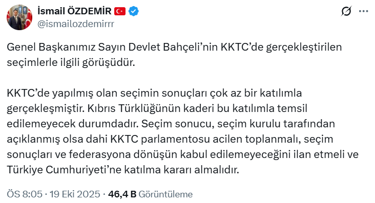 "Genel Başkanımız Sayın Devlet Bahçeli’nin KKTC’de gerçekleştirilen seçimlerle ilgili görüşüdür.