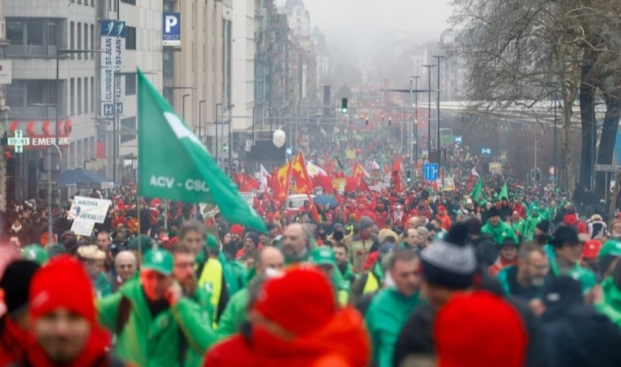 Belçika'daki bütün işçi sendikalarının çağrısı üzerine yaklaşık 60 bin kişi, Brüksel'in merkezindeki Kuzey Tren İstasyonu önünde bir araya geldi.