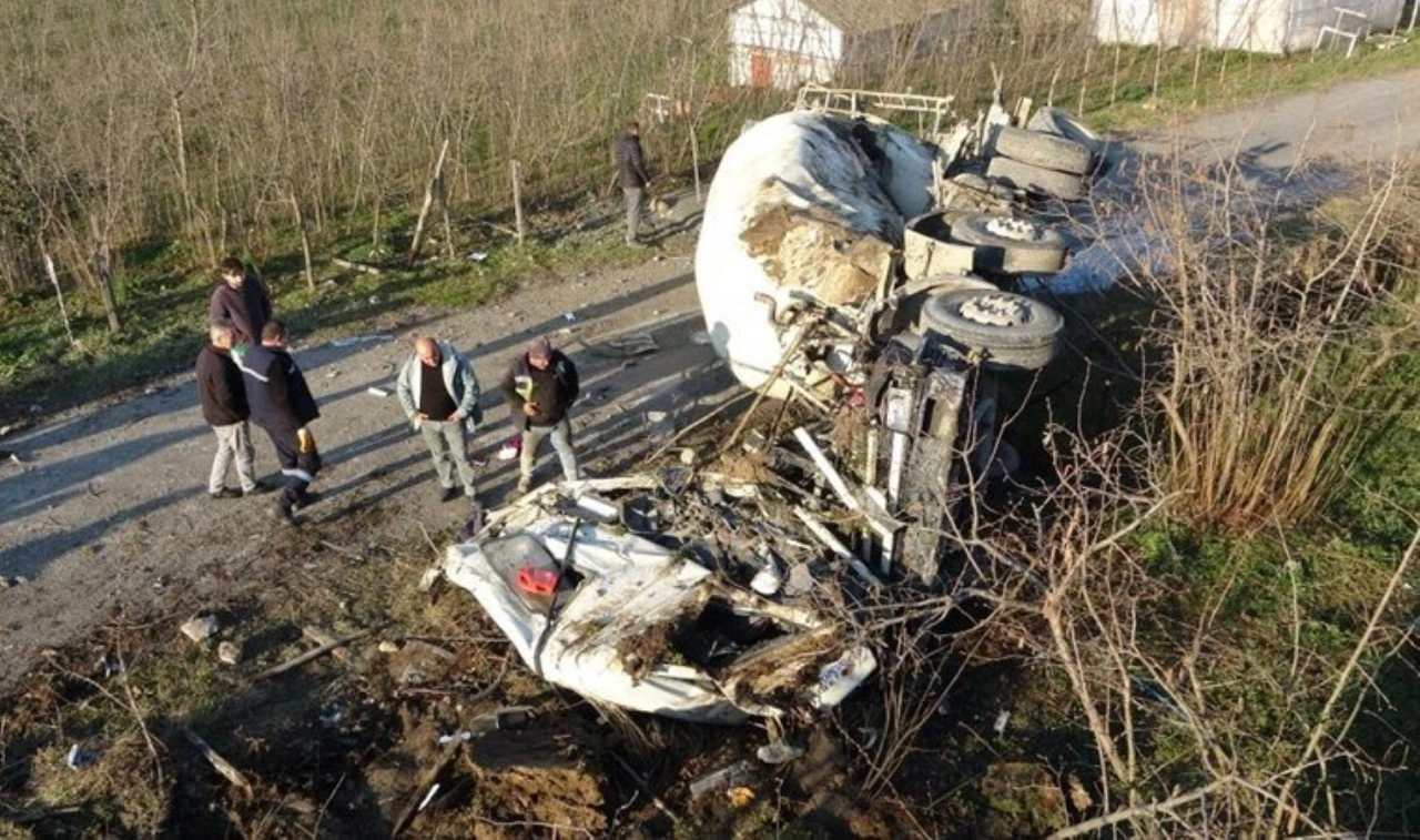 Ordu’da sürücüsünün kontrolünden çıkarak karşı şeride, ardından da istinat duvarından uçarak alt yola devrilen beton yüklü mikser kağıt gibi parçalandı, sürücü ağır yaralandı.