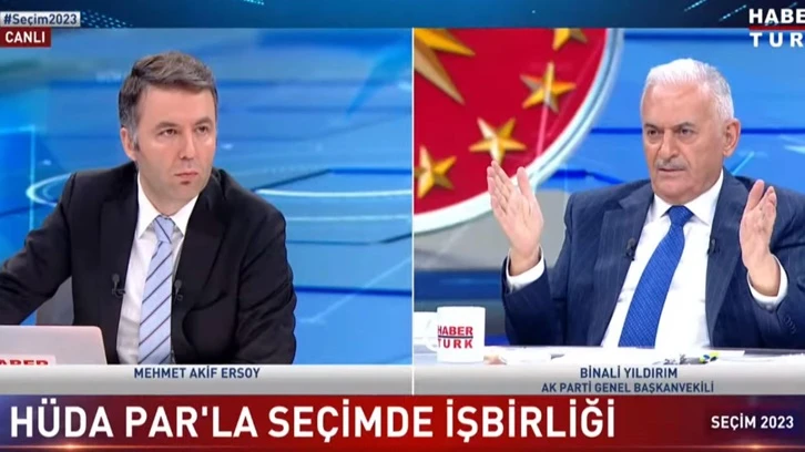Binali Yıldırım Habertürk canlı yayınında Mehmet Akif Ersoy'un sorularını yanıtladı. Ersoy'un "HÜDA-Par ittifakınızda" sözlerine "HÜDAPAR bizim ittifakın içinde değil" diyerek yanıt veren Yıldırım, "Evet. Sizin içinizde" cevabını aldı. Yıldırım'ın 'He, doğru' demesi ise dikkat çekti.