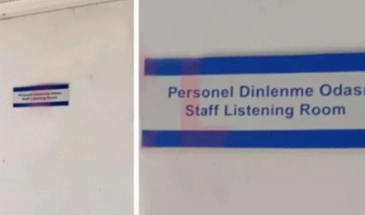 Bu odaların kapısına 'Personel dinlenme odası' yazıldı. Yazının altına İngilizce olarak ise 'Personel dinleme odası' anlamına gelen 'Staff listening room' yazıldı.