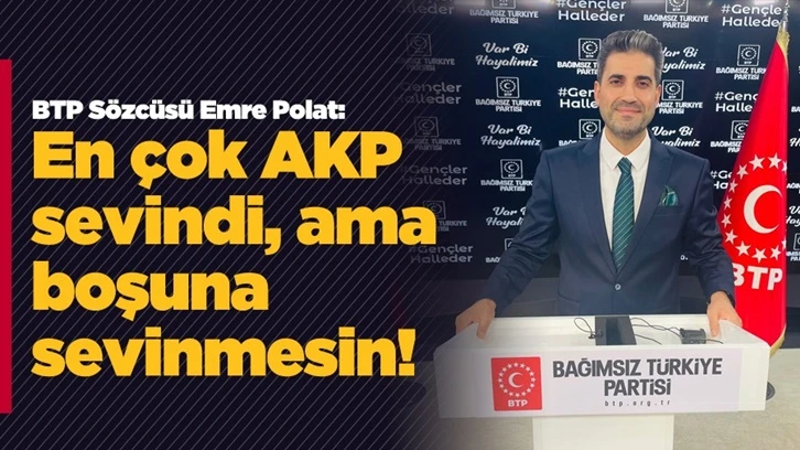 Bu karara en çok AKP sevindi ama boşuna sevinmesin diyen BTP Sözcüsü Emre Polat, ‘Siyasette kavganın değil olgunluğun temsilcisi olan Bağımsız Türkiye Partisi, Türkiye’de genliğin ve toplumun umudu olmaya devam edecektir’ açıklamasında bulundu.