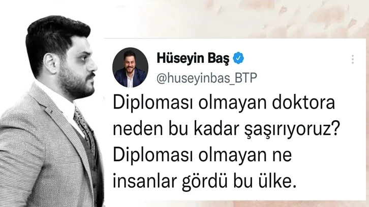 BTP Genel Başkanı Hüseyin Baş'ın Twitter hesabından yaptığı paylaşım su şekilde, "Diploması olmayan doktora neden bu kadar şaşırıyoruz? Diploması olmayan ne insanlar gördü bu ülke"