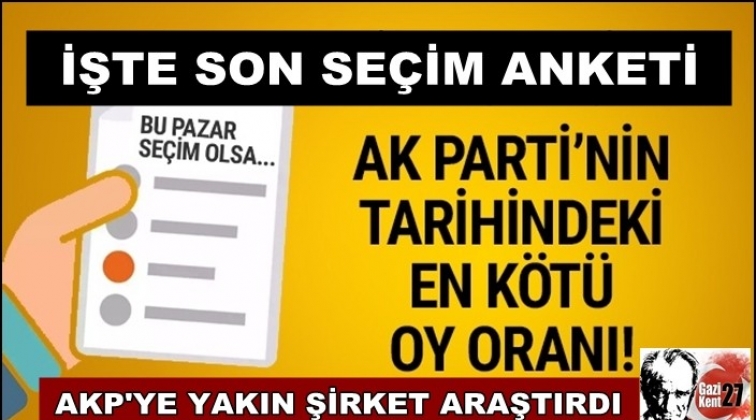 AKP'ye yakın olduğu iddia edilen şirketin yaptığı anket sonuçlarına göre, "Bu Pazar Milletvekili genel seçimi olsa, hangi partiye oy verirsiniz" sorusuna, seçmenlerin yüzde 30.6'sı AKP derken, yüzde 26.5'i ise CHP'yi işaret etti.